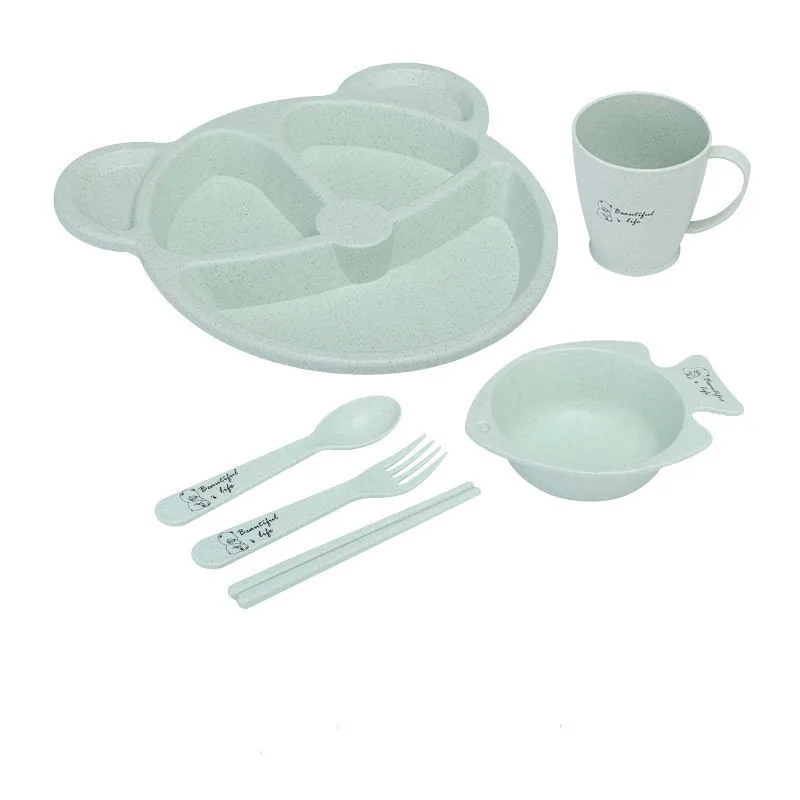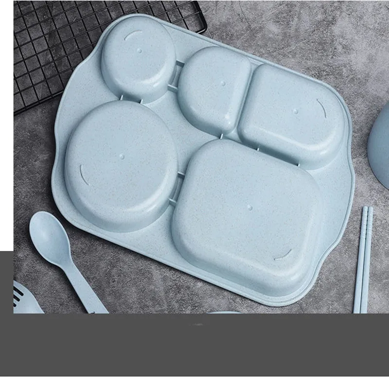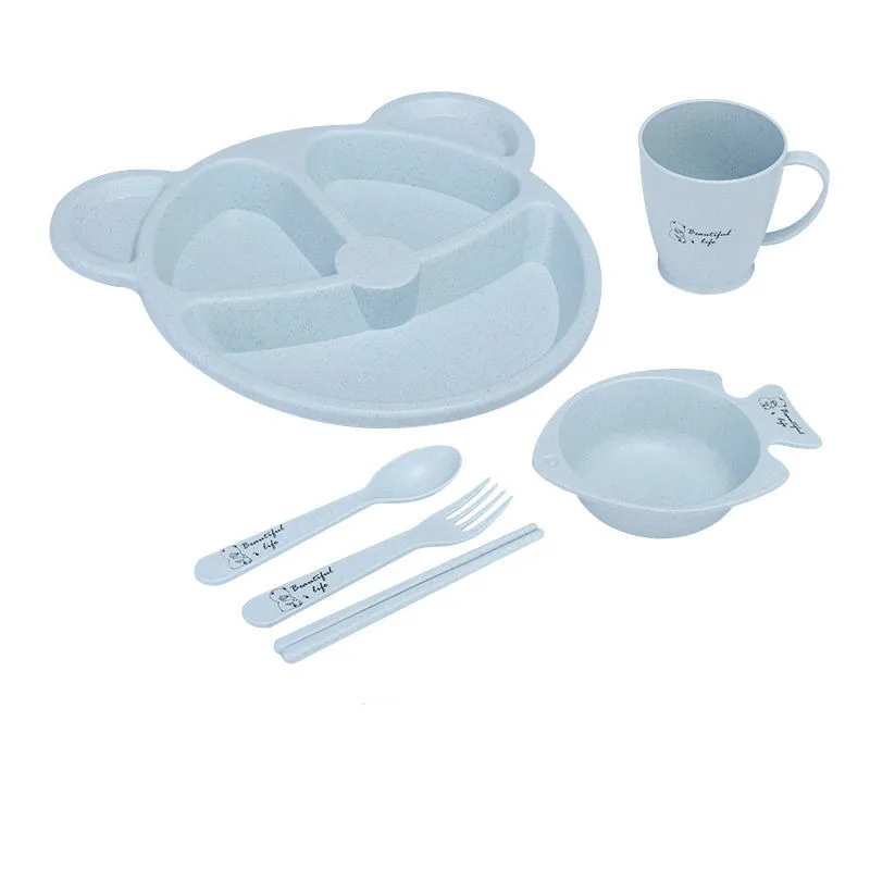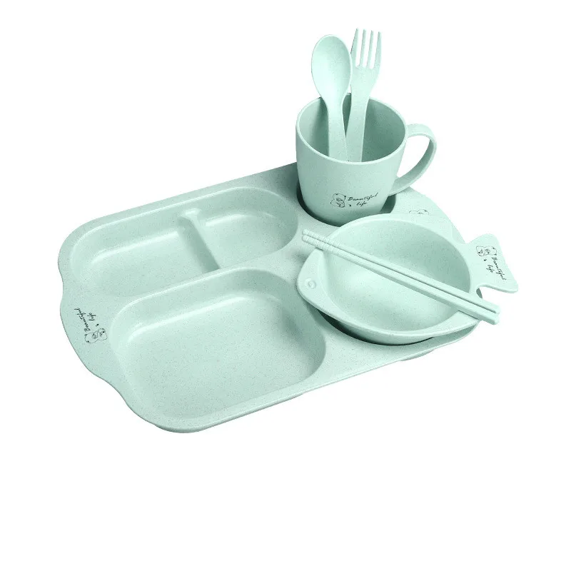 The 6-piece set includes spoon and fork. Chopsticks, bowls, cups, plates. Color: blue, pink, green, beige; 5 compartments, can hold different food.